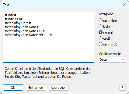 Mit den Schlüsselworten können fixe Werte auf der Druckseite platziert werden. Dabei können auch Schlüsselworte in einem Fließtext zusammengefasst werden (außer Select). Auch Freitexte (ohne "") und Zeilenumbrüche sind zulässig.