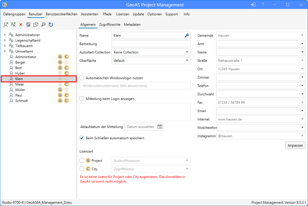 (z.B.: Zuordnung der Lizenzart, Hinterlegung von Kontaktinformationen, Zuordnung von Zugriffsberechtigungen auf die Daten, ...)