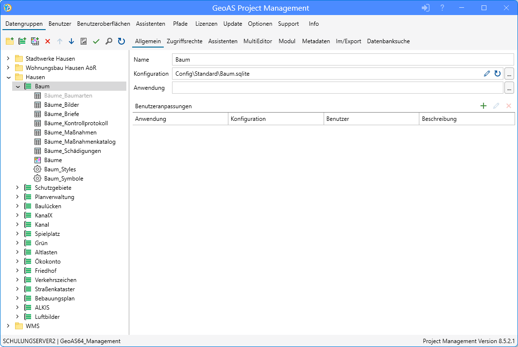 Einer Datengruppe können Tabellen (Relationen/Layer), Fachmodule und Zugriffsrechte zugeordnet werden.