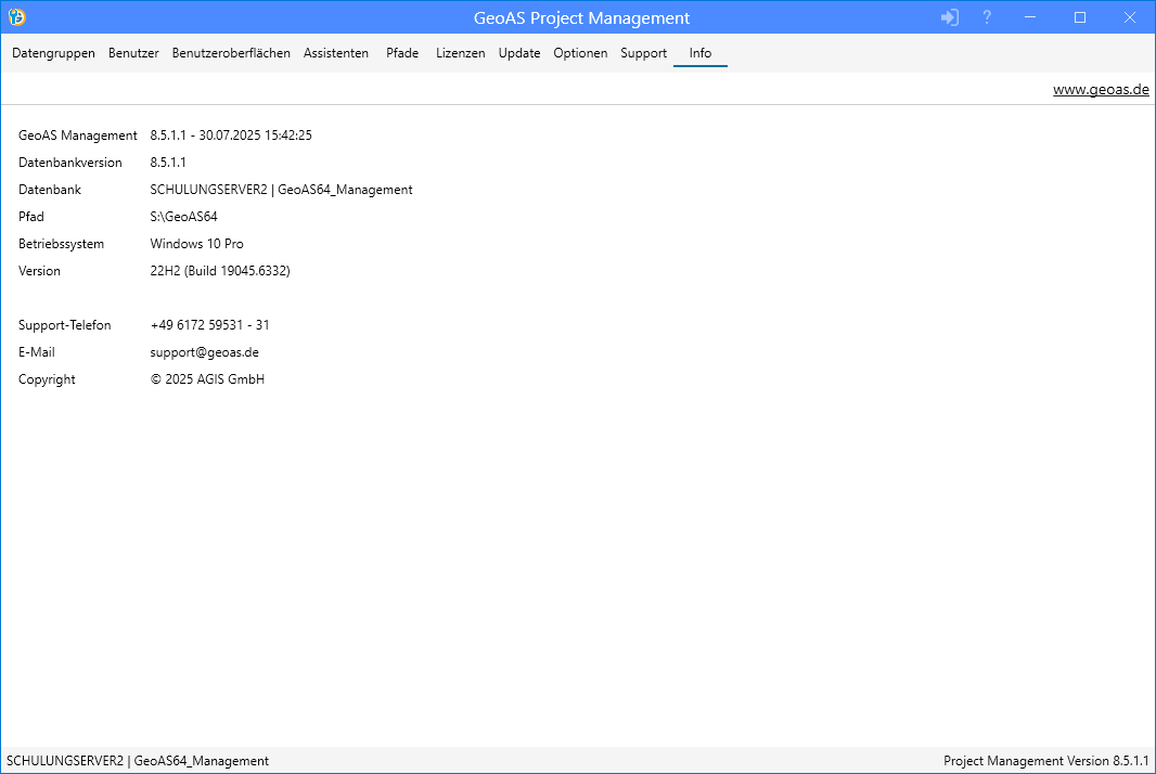 In diesem Dialog werden die wichtigsten Informationen zur aktuell installierten Version von GeoAS Project angezeigt.
