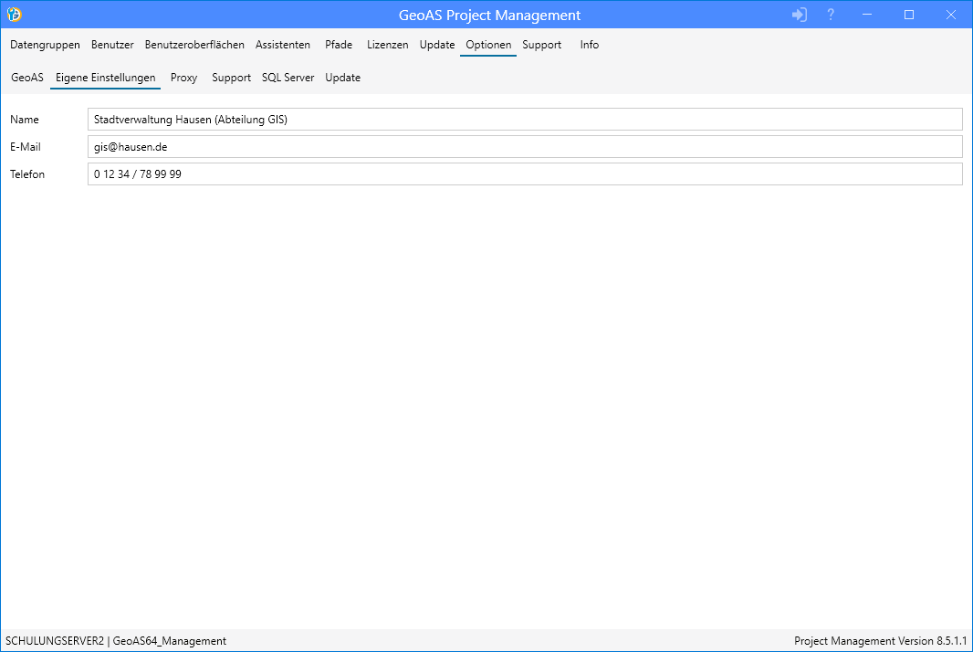 Über diesen Dialog können Einstellungen zum Versand E-Mails an den GeoAS Support vorgenommen werden.