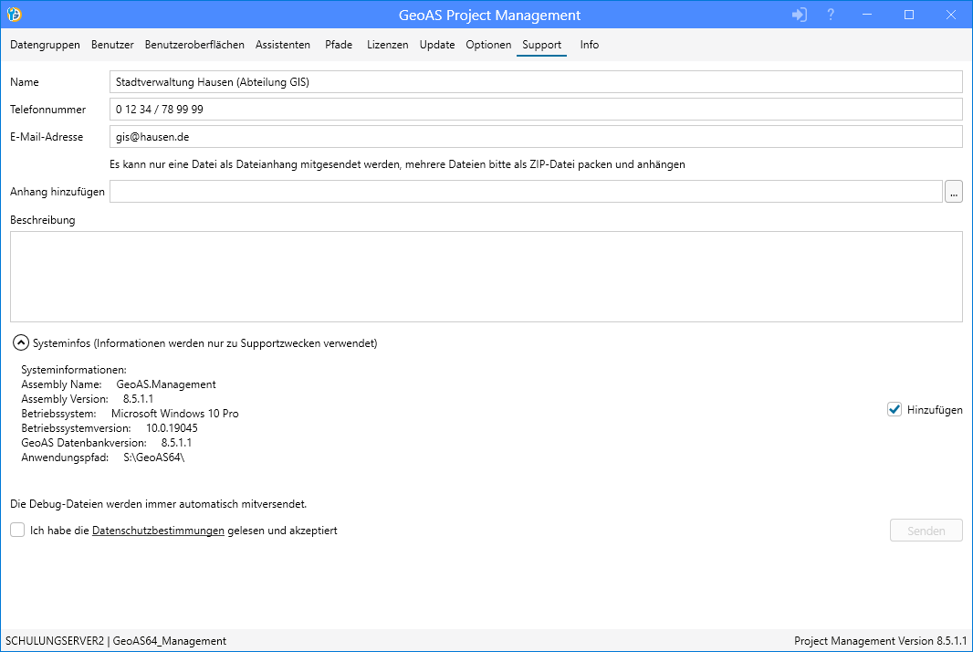 Die integrierte Supportfunktion ermöglicht, direkt mit dem GeoAS Support per E-Mail in Kontakt zu treten. Per E-Mail können Fehlerbeschreibungen und systemspezifische Dateien automatisch übermittelt werden. Optional kann die Nachricht um einen Dateianhang ergänzt werden. Dies erleichtert den Support-Mitarbeitern die Fehleranalyse und beschleunigt die Bearbeitungszeit.
