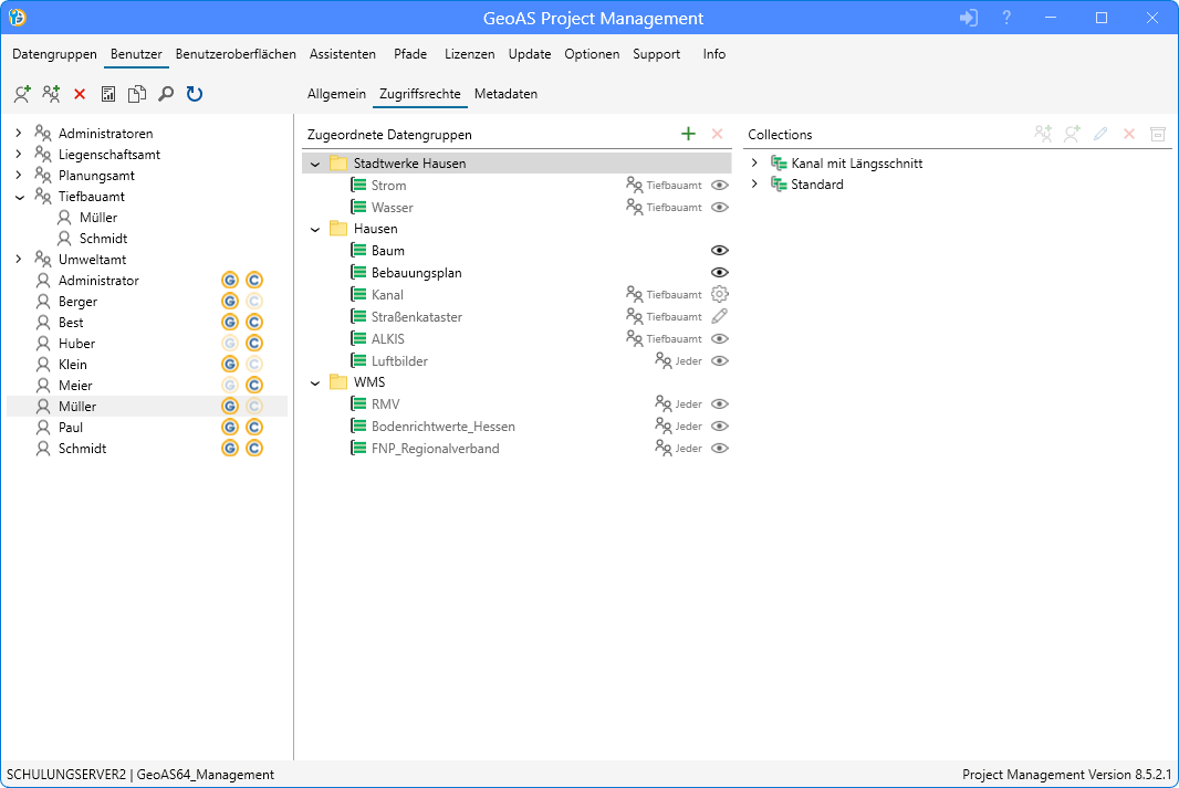 Über die Registerkarte Zugriffsrechte werden zentrale Einstellungen für die ergänzende Organisation der Benutzer von GeoAS Project und GeoAS City vorgenommen.