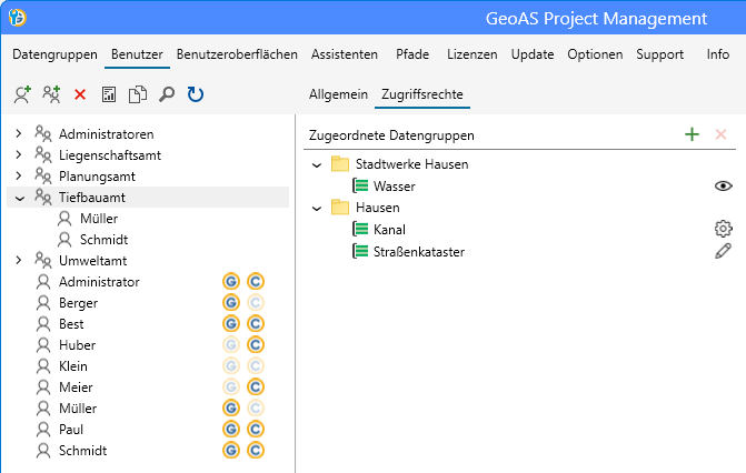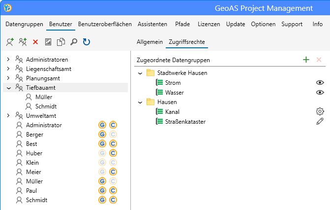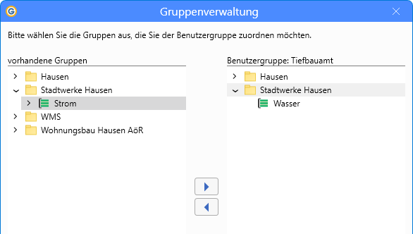 (In diesem Beispiel: Der Benutzergruppe "Tiefbauamt" wurde die Datengruppe "Strom" ergänzend zur Datengruppe "Wasser" zugeordnet.)