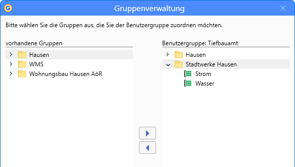 In diesem Beispiel soll der Benutzergruppe "Tiefbauamt" die Datengruppe "Strom" ergänzend zur Datengruppe "Wasser" zugeordnet werden.
