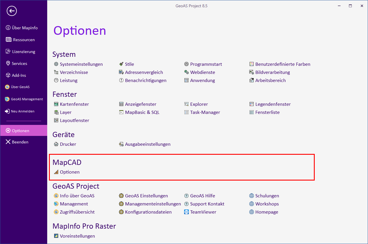 Detaillierte Informationen entnehmen Sie bitte aus der Dokumentation: Voreinstellungen => MapCAD