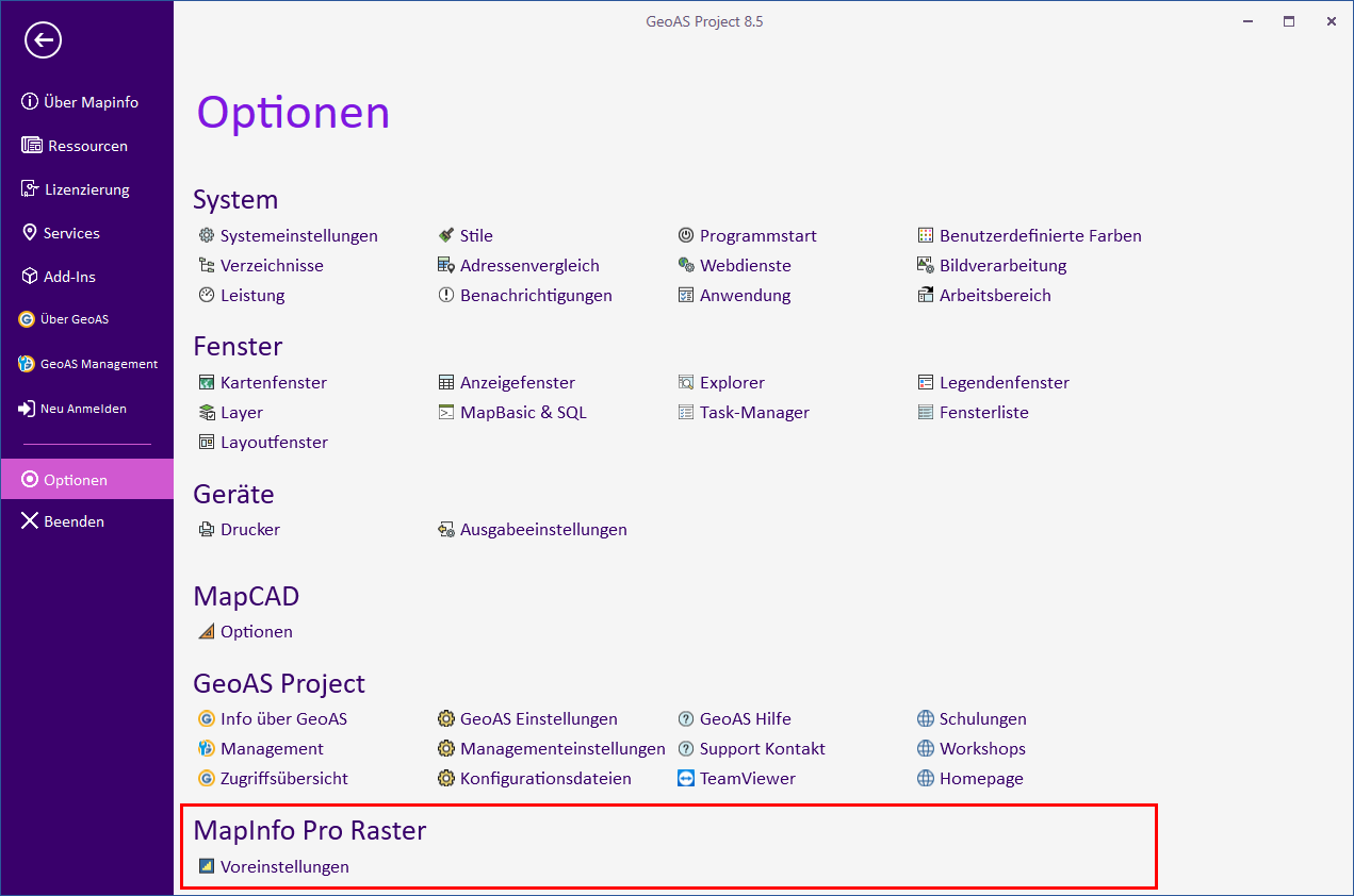 Voreinstellungsmöglichkeiten zu: MapInfo Pro Raster