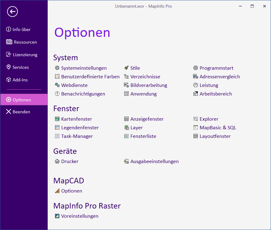 Die grundlegenden Voreinstellungen für MapInfo Pro 64-Bit werden im sogenannten "Backstage"-Bereich festgelegt: