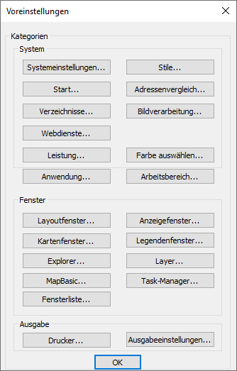 MapInfo > Einstellungen (Dialog für die Einstellungen für MapInfo)